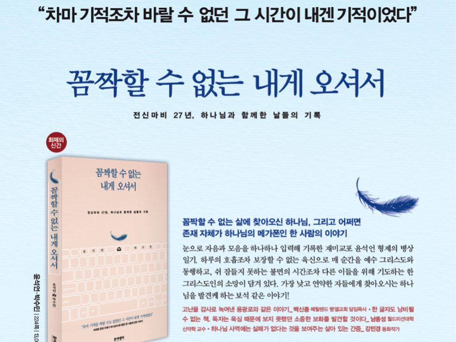 본교 목회학과(M.Div)에 재학중인 윤석언 학우 (미국 메릴랜드 거주)와 박수민 학우 (폴란드 바르샤바 거주)가 공저로 “꼼짝할 수 없는 내게 오셔서” 신간을……