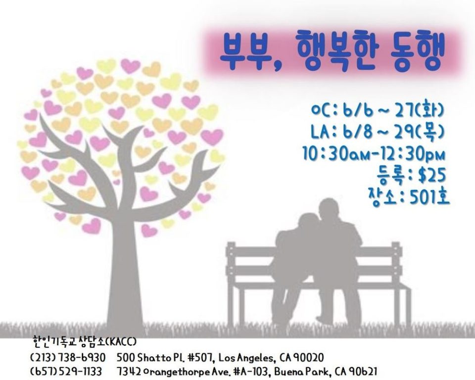 한인기독교 상담소(KACC)에서는 6월 한 달간 ‘부부, 행복한 동행’ 라는 주제로 소그룹 세미나를 진행합니다. 현재 자신의 결혼 생활을 평가하고, 행복한 결혼생활을 위해 부부가 꼭 알아야 하는 중요한 원칙들을 배우는 유익한 시간이…