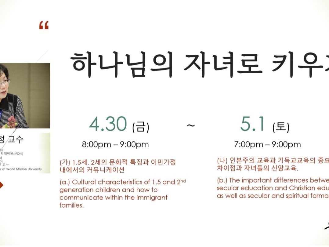 본교 온라인교육 디렉터 최윤정교수는 4월 30일-5월1일까지 ‘하나님의 자녀로 키우기’ 라는 주제로 기독교 교육 세미나를 개최했다.